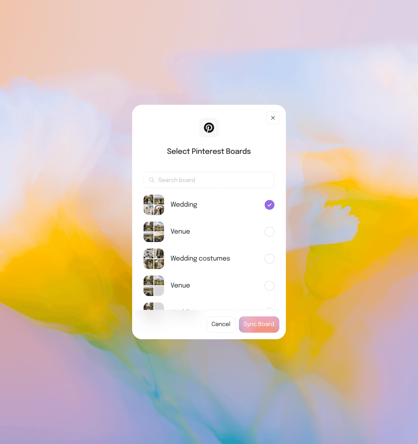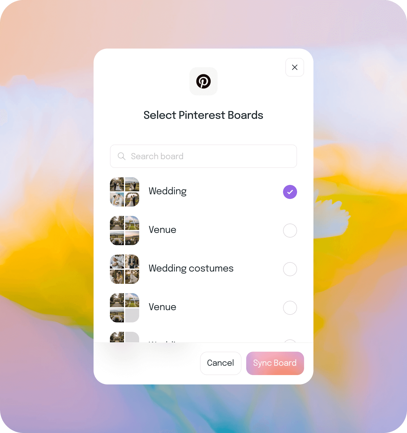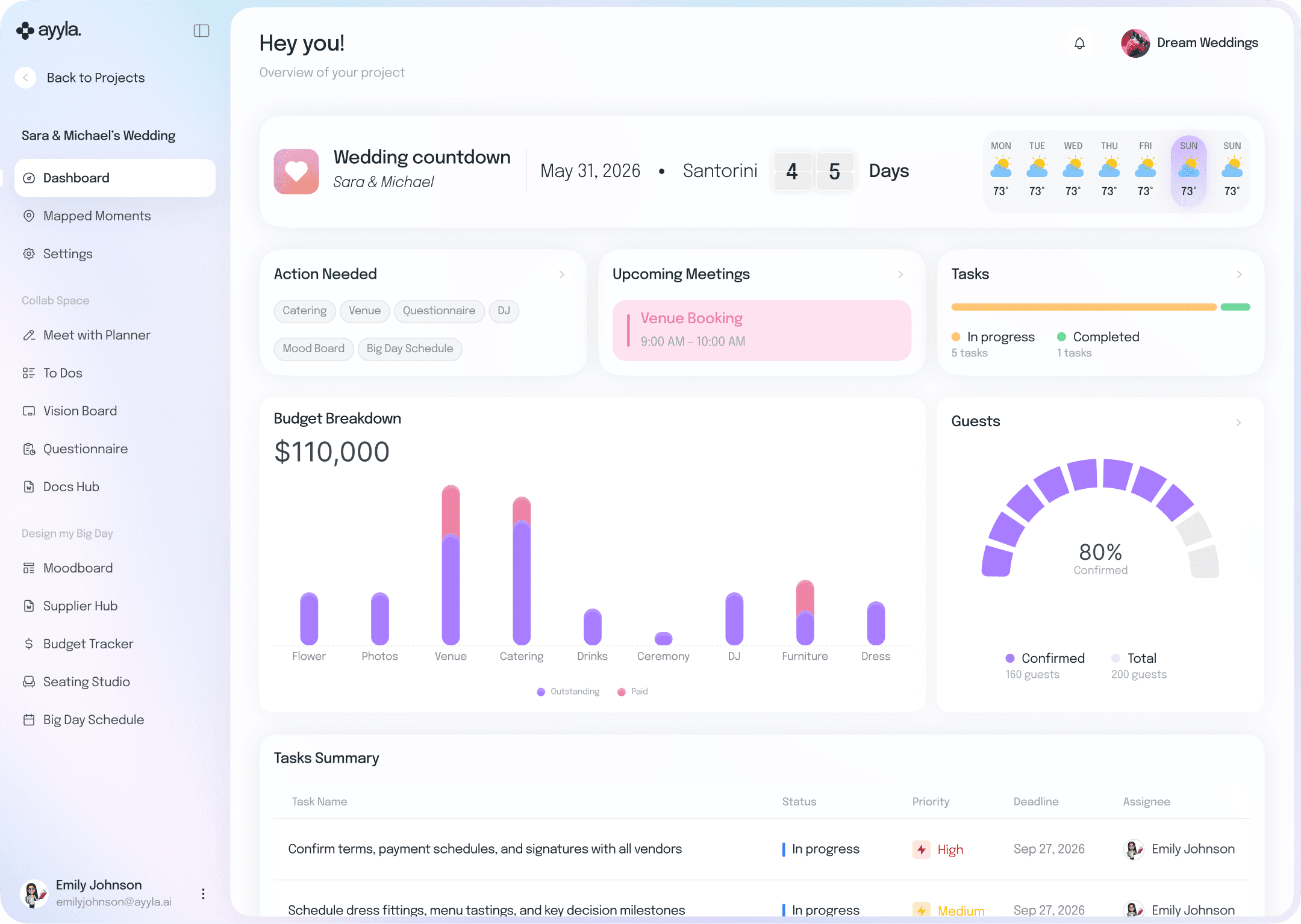 A clean dashboard for moodboards, docs, approvals, budget, and seating — with permissions you control.
