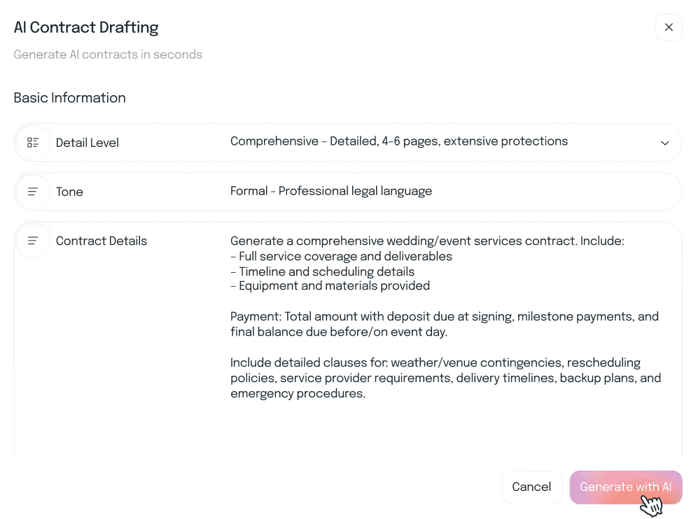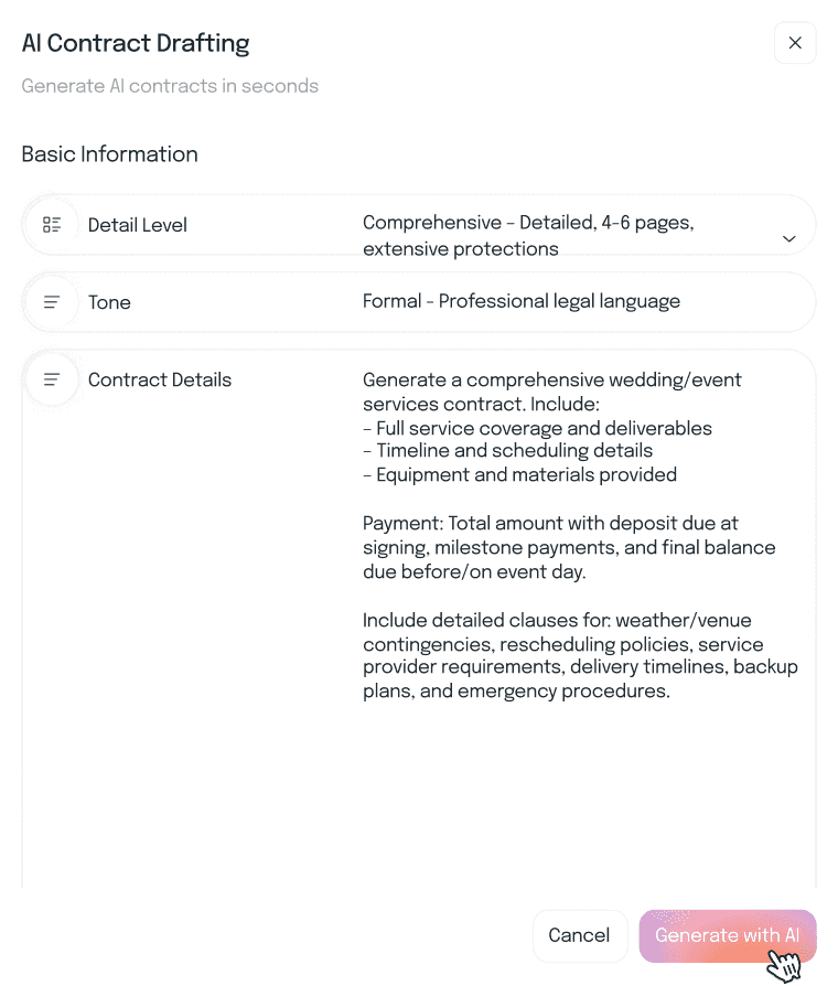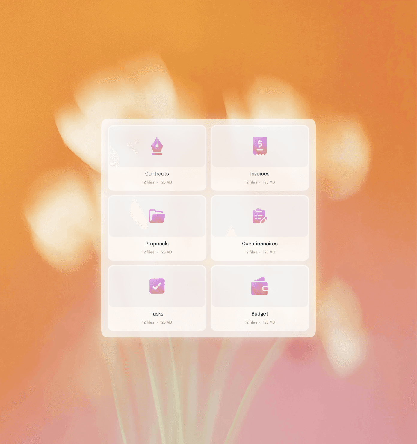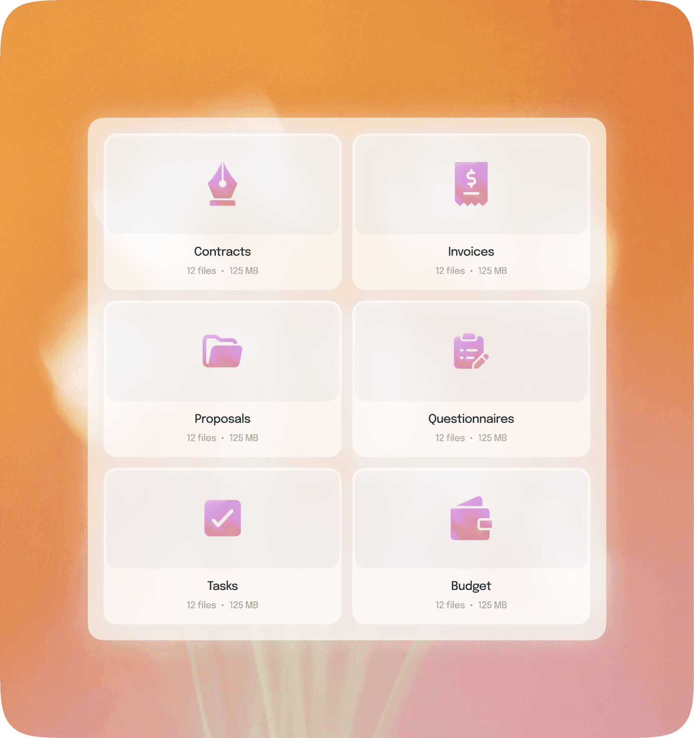 A clean dashboard for moodboards, docs, approvals, budget, and seating — with permissions you control.